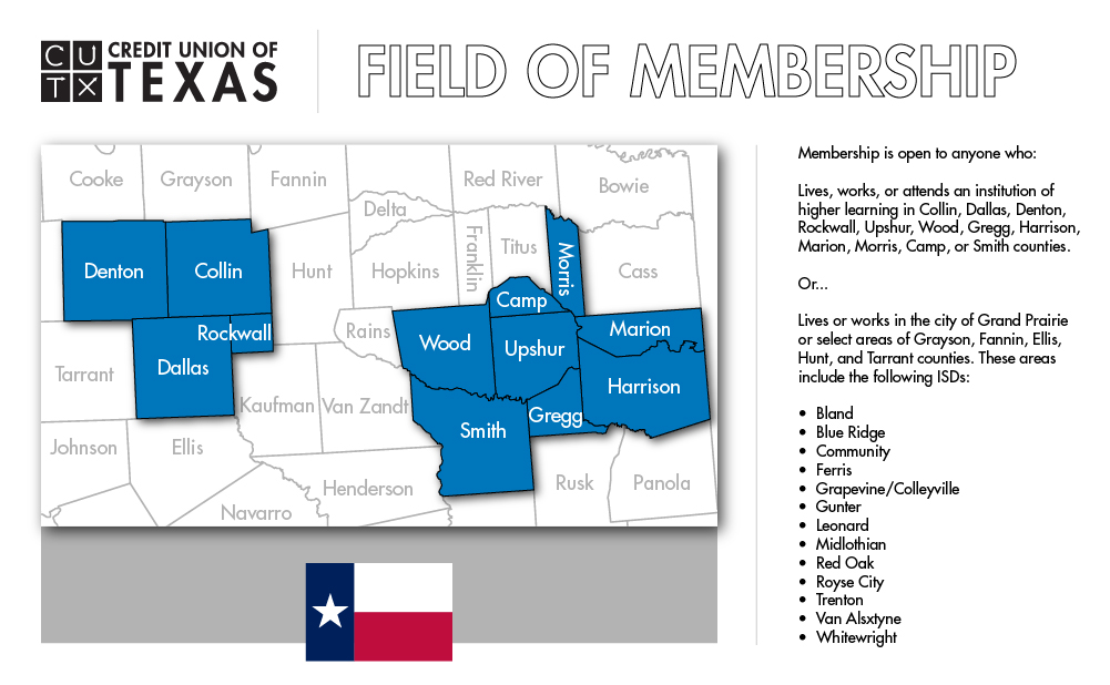 - Anyone related (by blood, marriage or adoption) to individuals that meet the qualifications above or is already a member with Credit Union of Texas.